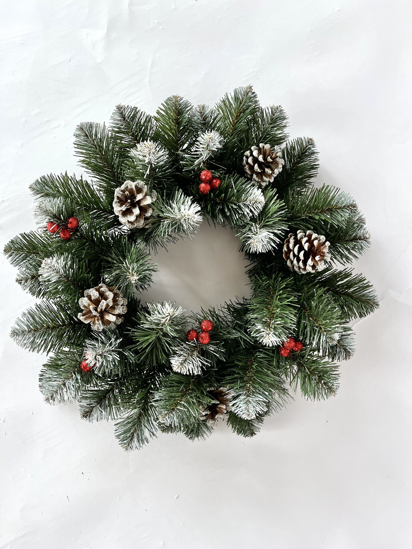 Декоративний вінок "Різдвяний з шишками" виготовлений із ПВХ-плівки та натуральних шишок, покритих блискітками.