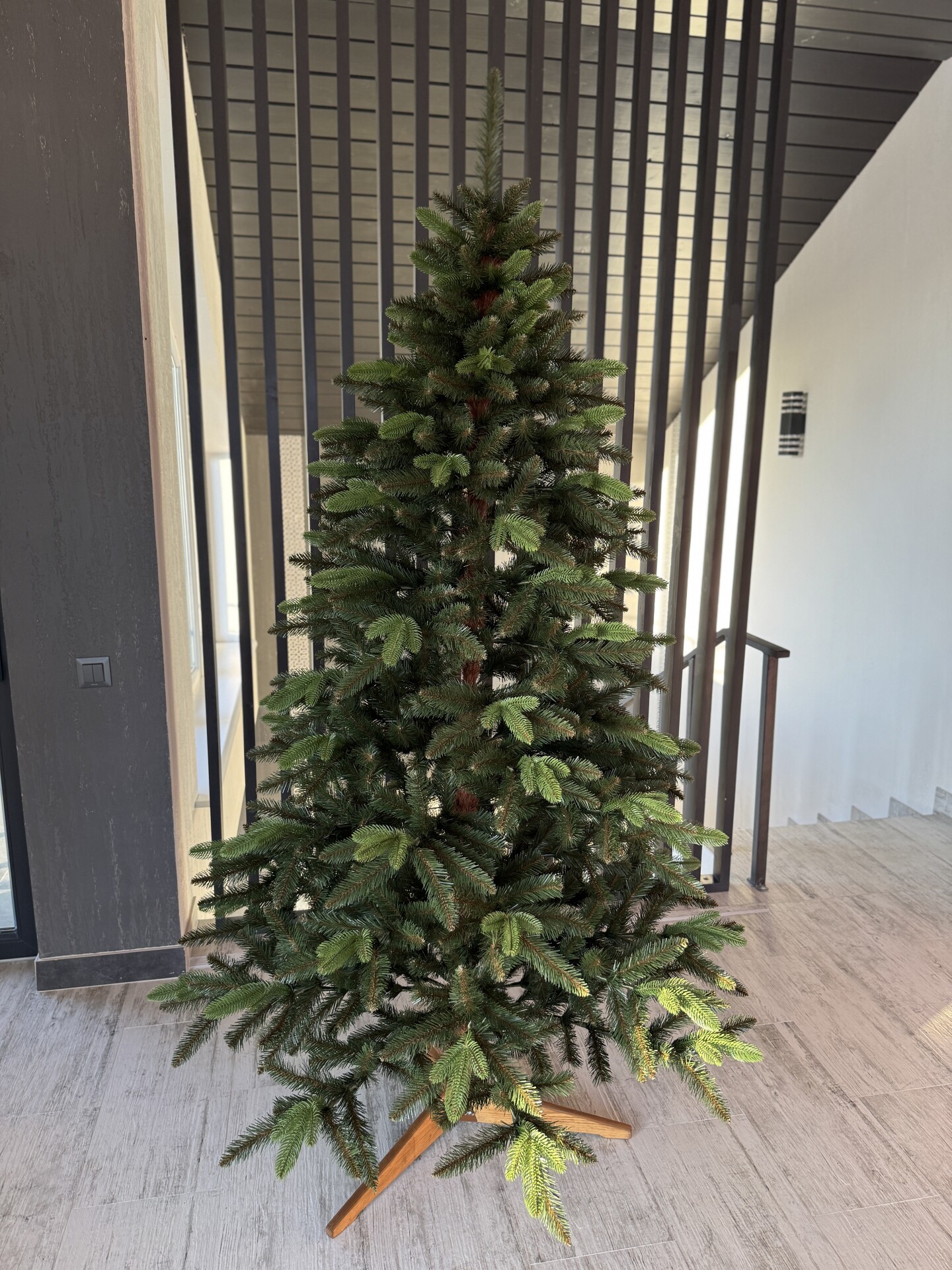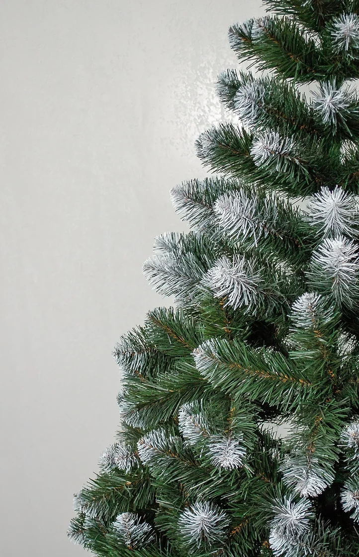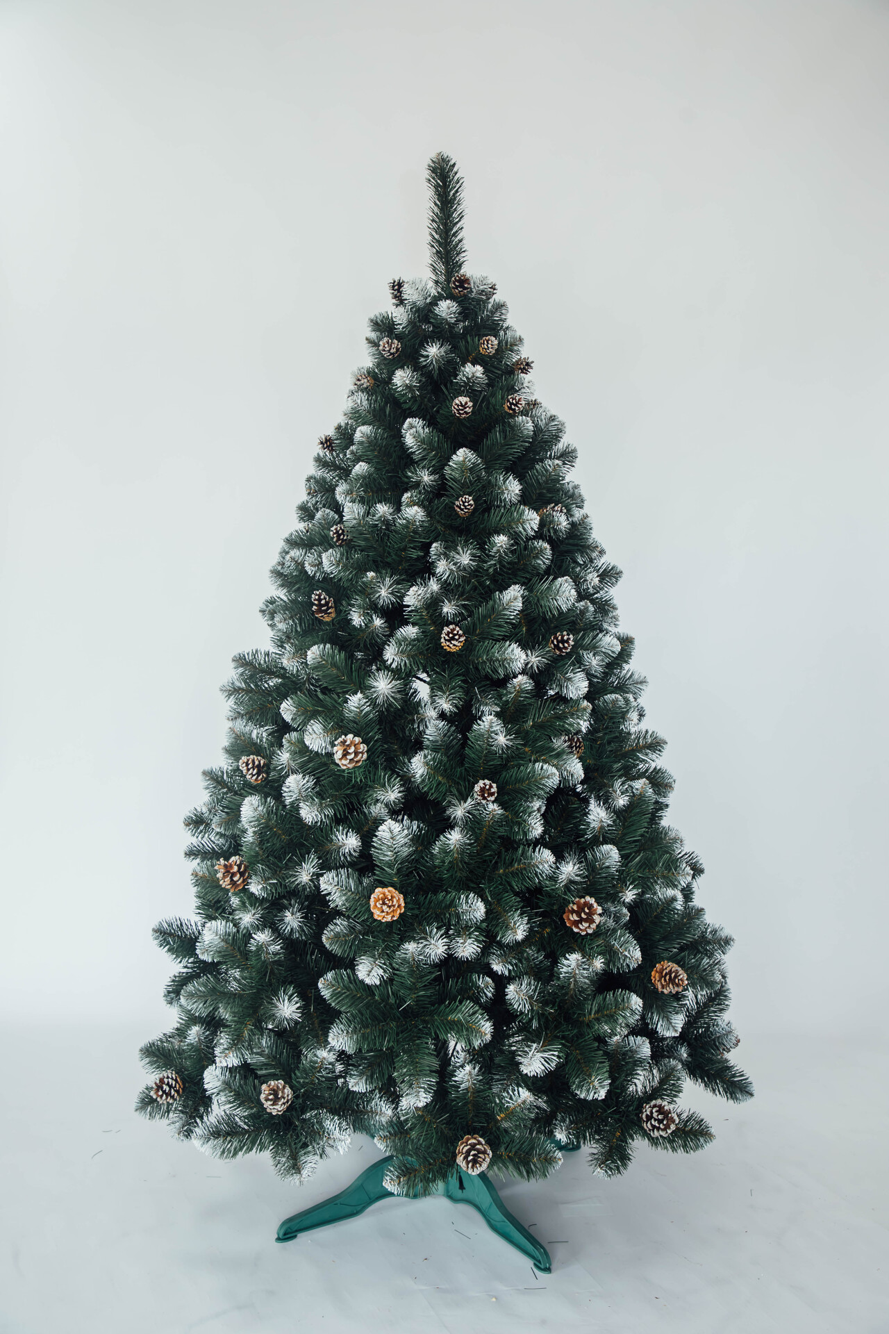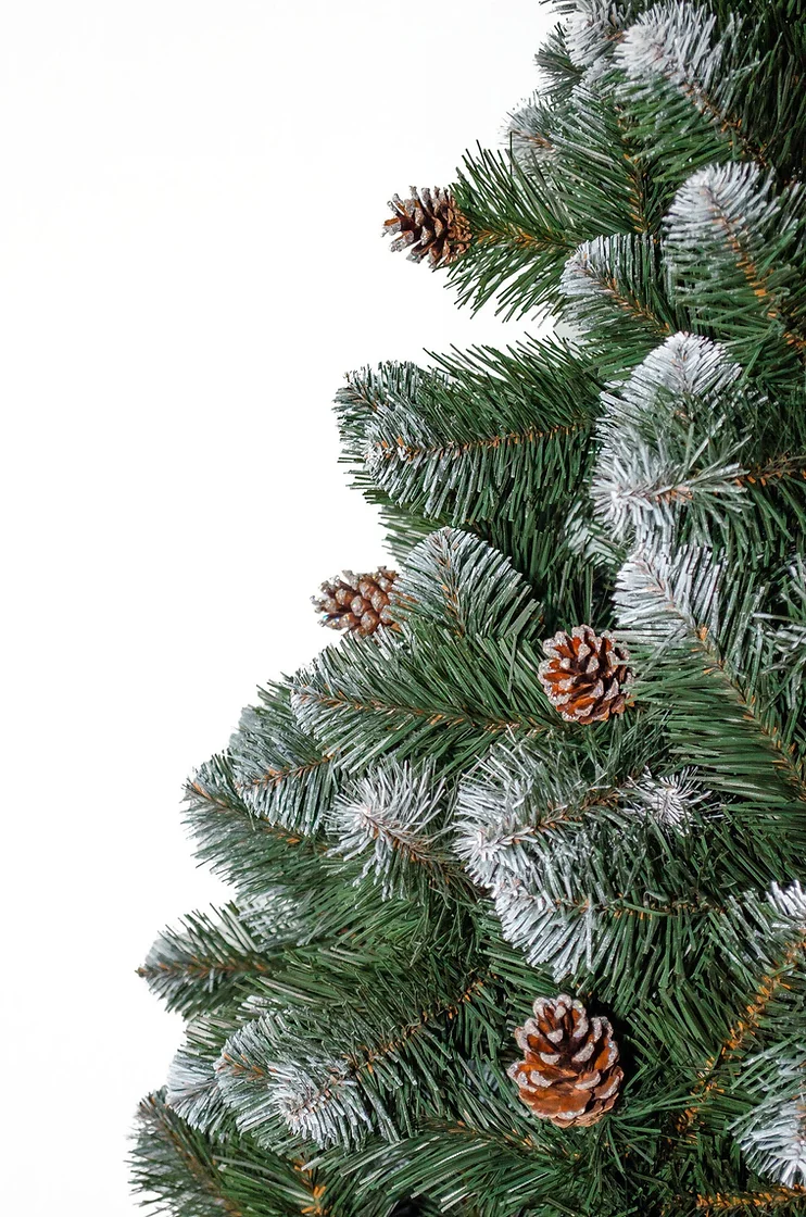 «Різдвяна з шишками» — це зелена ялинка з білими кінчиками та натуральними шишками, яка вже кілька років залишається бестселером серед моделей із ПВХ. Її гілочки мають закруглені краї та легке біле напилення, що створює ефект снігу й додає святкової атмосфери.