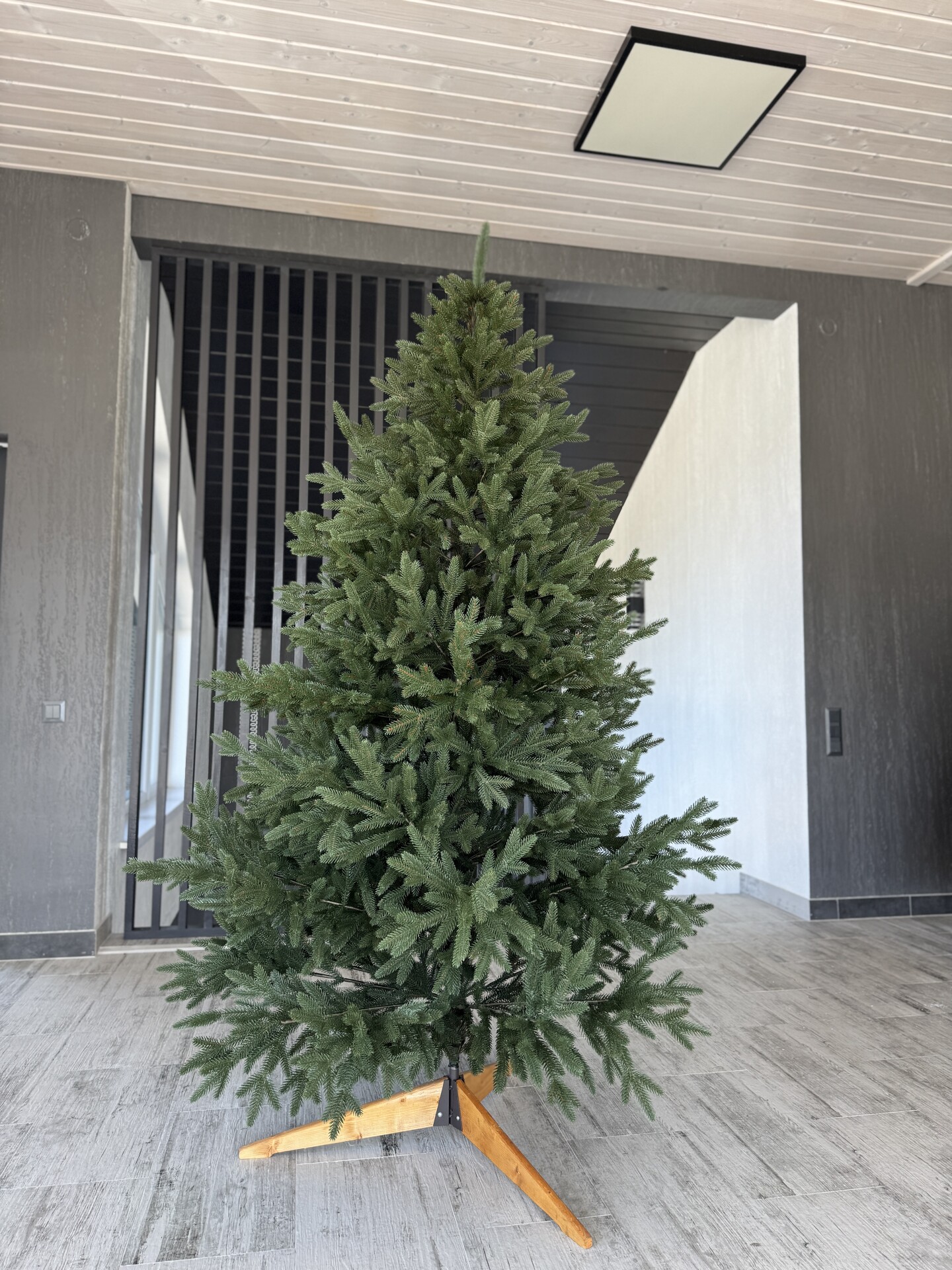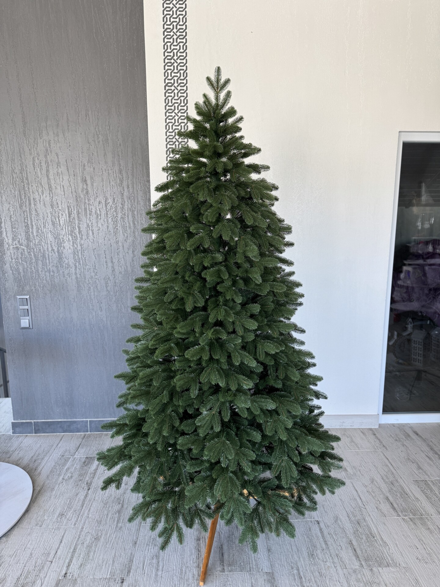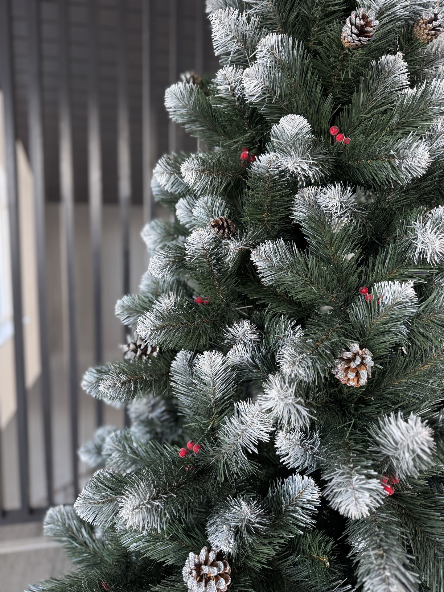 «Різдвяна з шишками» — це зелена ялинка з білими кінчиками та натуральними шишками, яка вже кілька років залишається бестселером серед моделей із ПВХ. Її гілочки мають закруглені краї та легке біле напилення, що створює ефект снігу й додає святкової атмосфери.