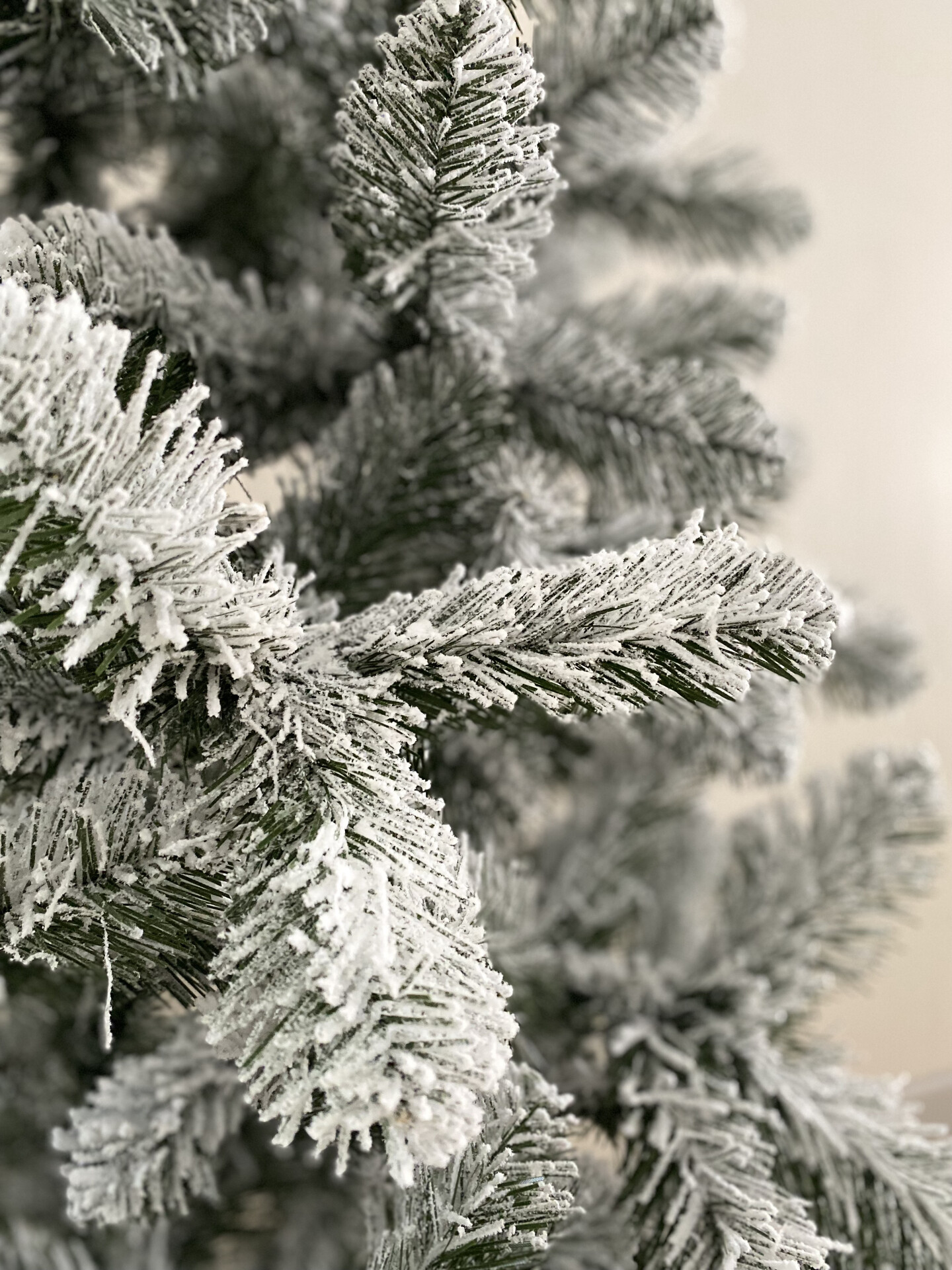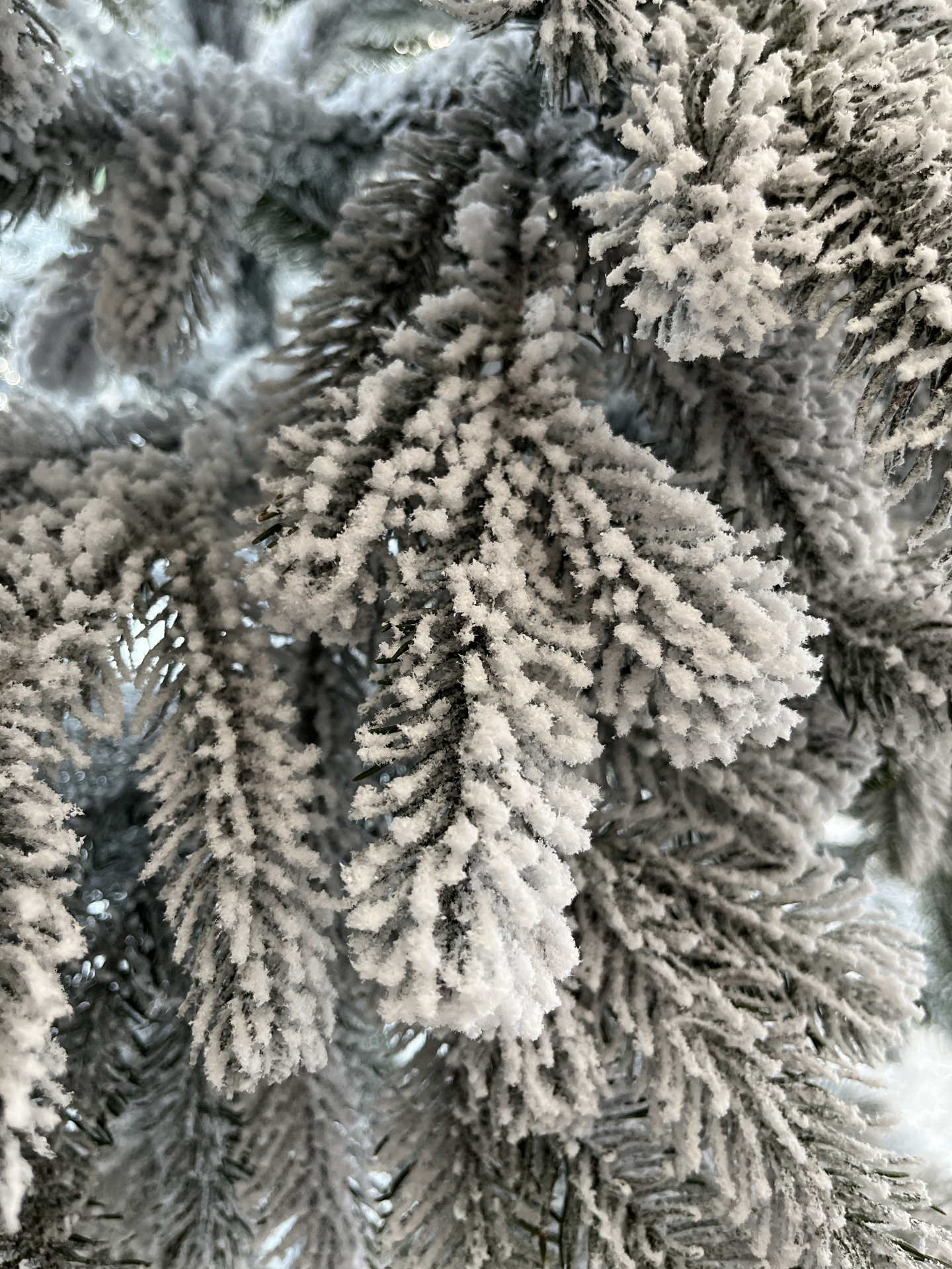 •Виготовлена з ПВХ-плівки, ялинка має темно-зелений колір та повністю покрита пухнастим снігом, що надає їй ефекту щойно присипленої снігом.