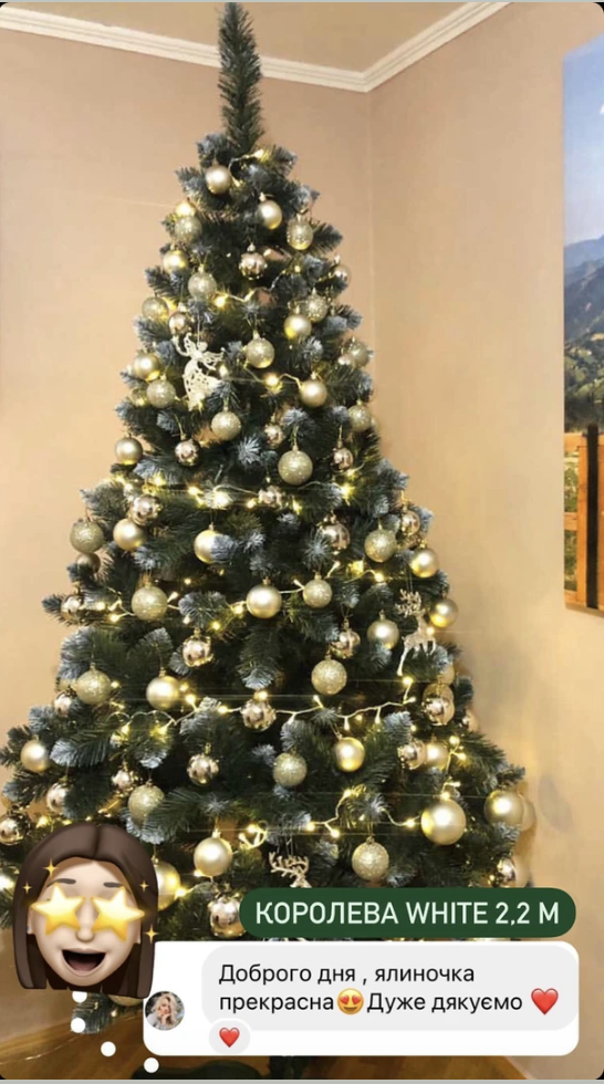«Королева White» — це зелена ялинка з білими кінчиками, яка вже кілька років є бестселером серед моделей із ПВХ. Гілочки з білим напиленням створюють об’ємний та святковий вигляд.