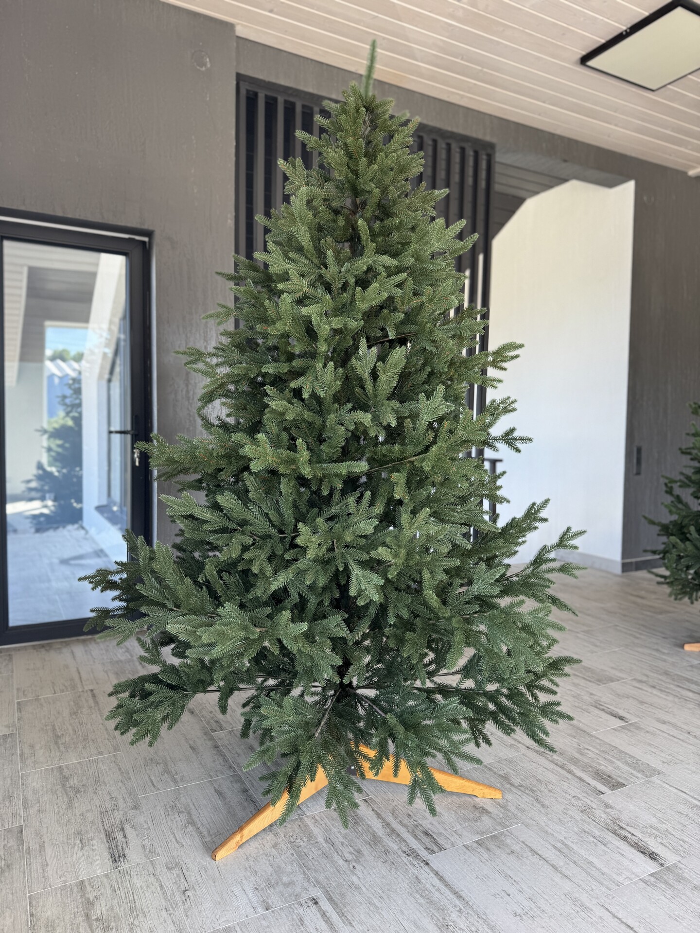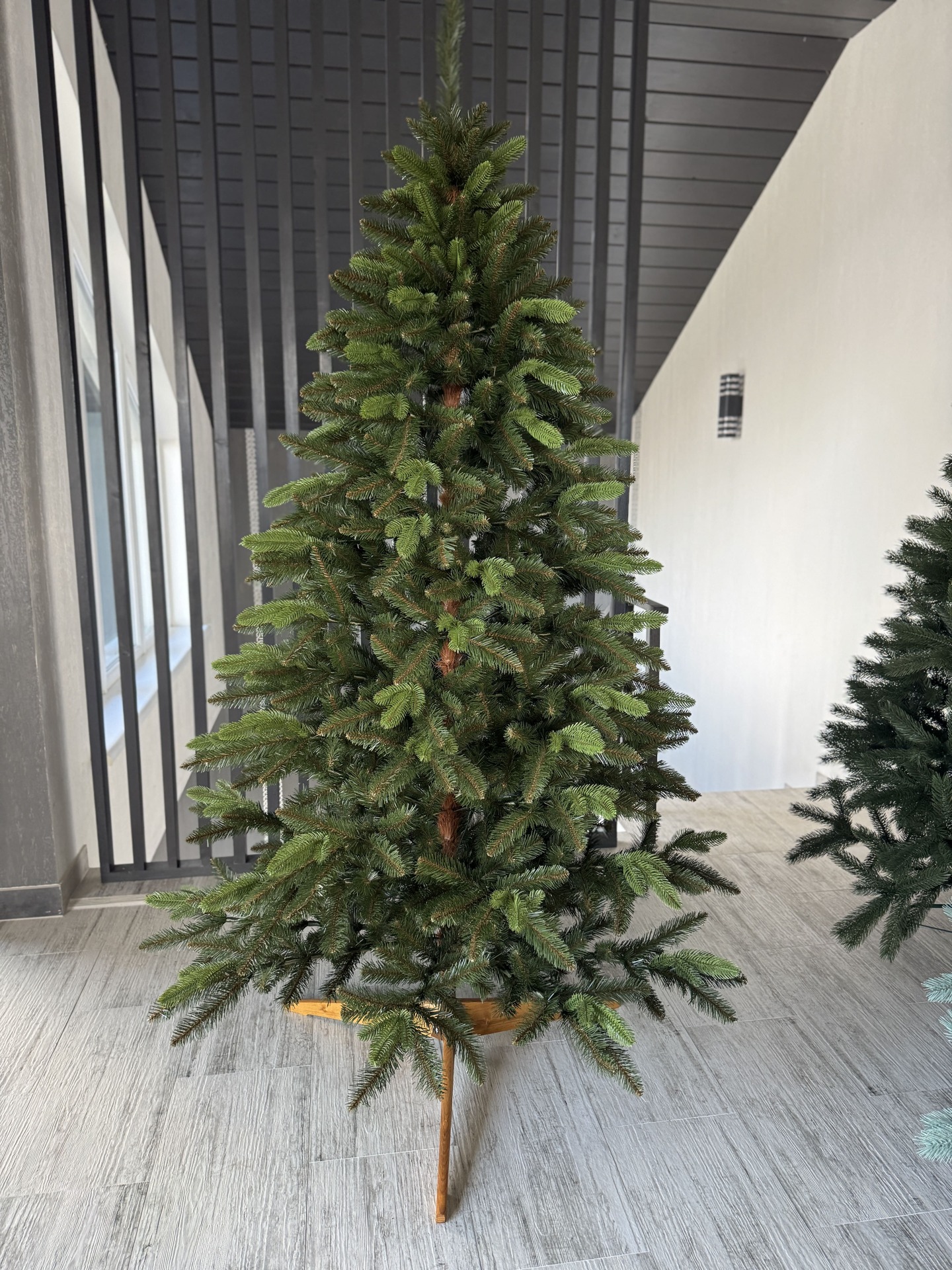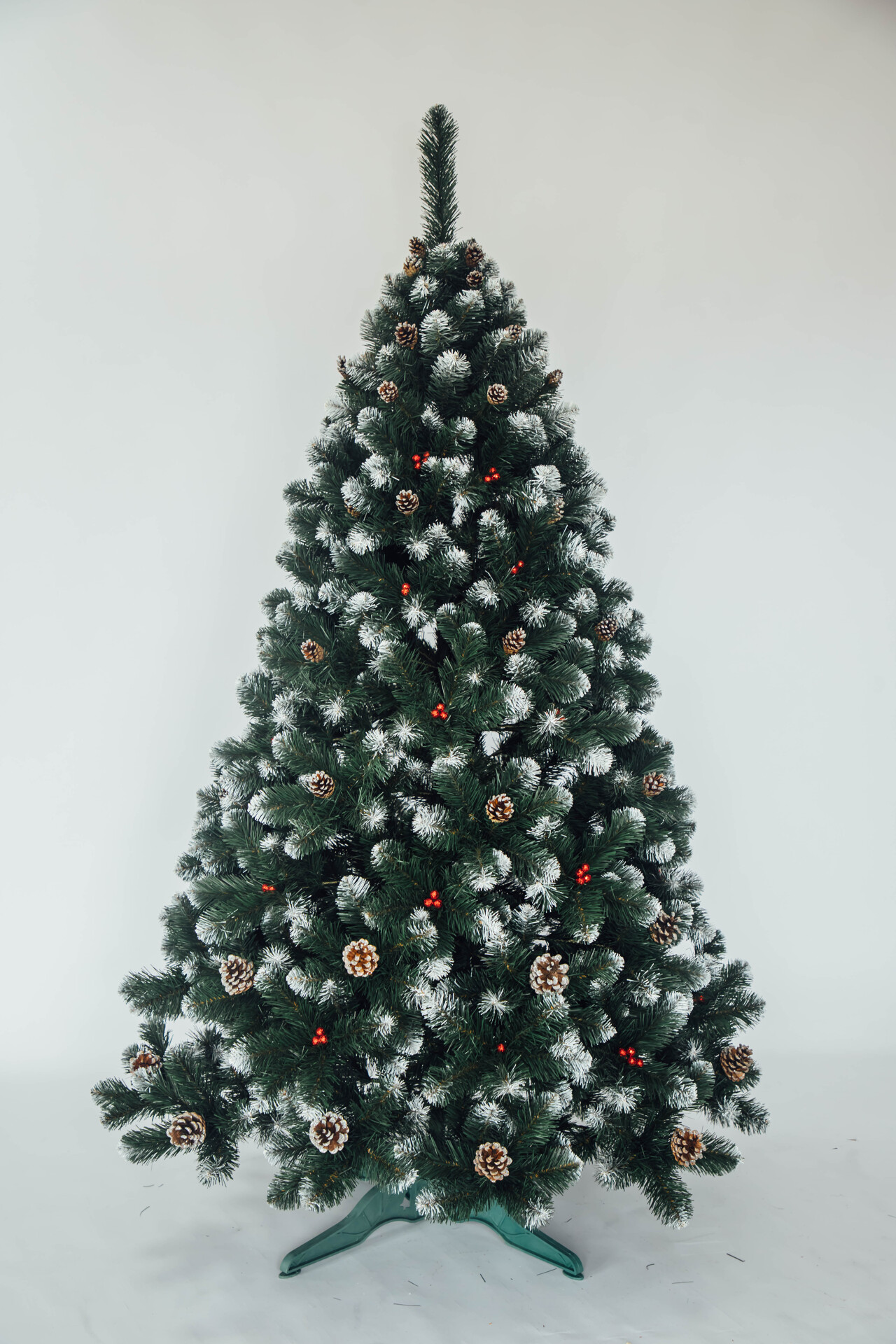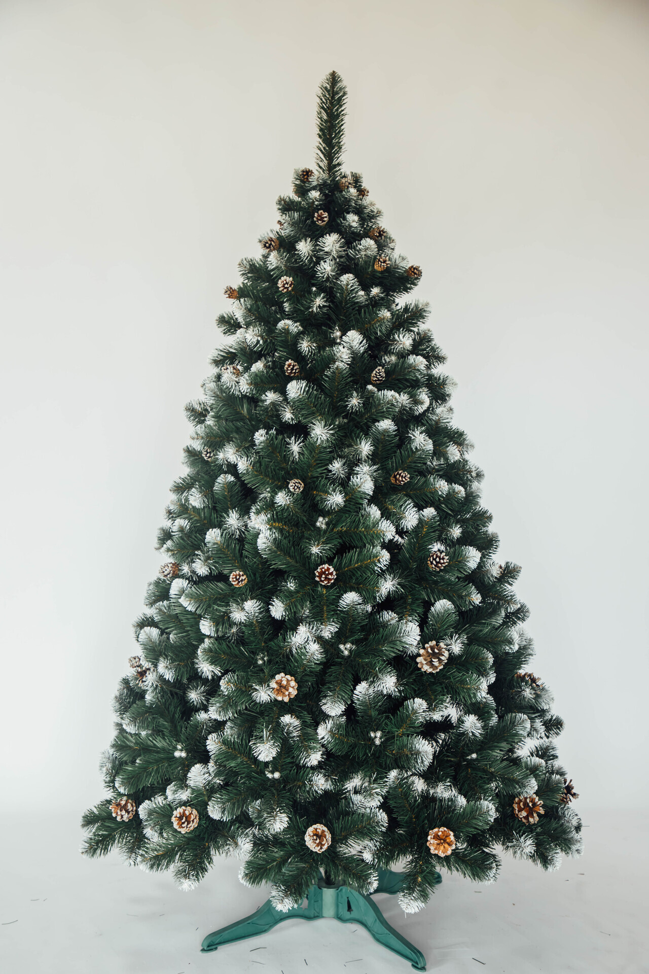«Різдвяна з шишками» — це зелена ялинка з білими кінчиками та натуральними шишками, яка вже кілька років залишається бестселером серед моделей із ПВХ. Її гілочки мають закруглені краї та легке біле напилення, що створює ефект снігу й додає святкової атмосфери.