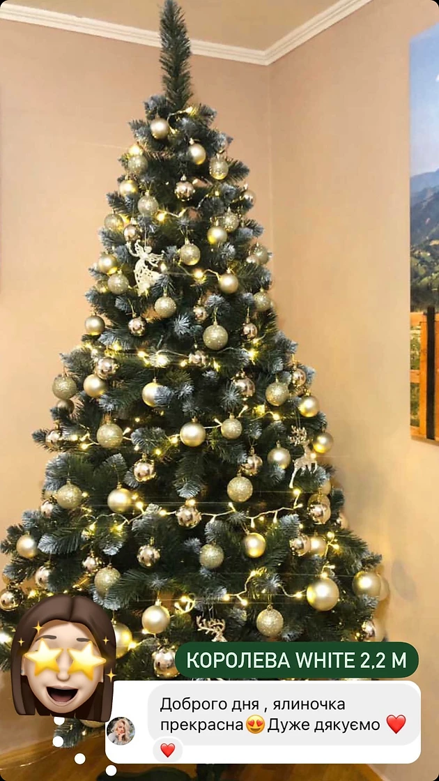 «Королева White» — це зелена ялинка з білими кінчиками, яка вже кілька років є бестселером серед моделей із ПВХ. Гілочки з білим напиленням створюють об’ємний та святковий вигляд.