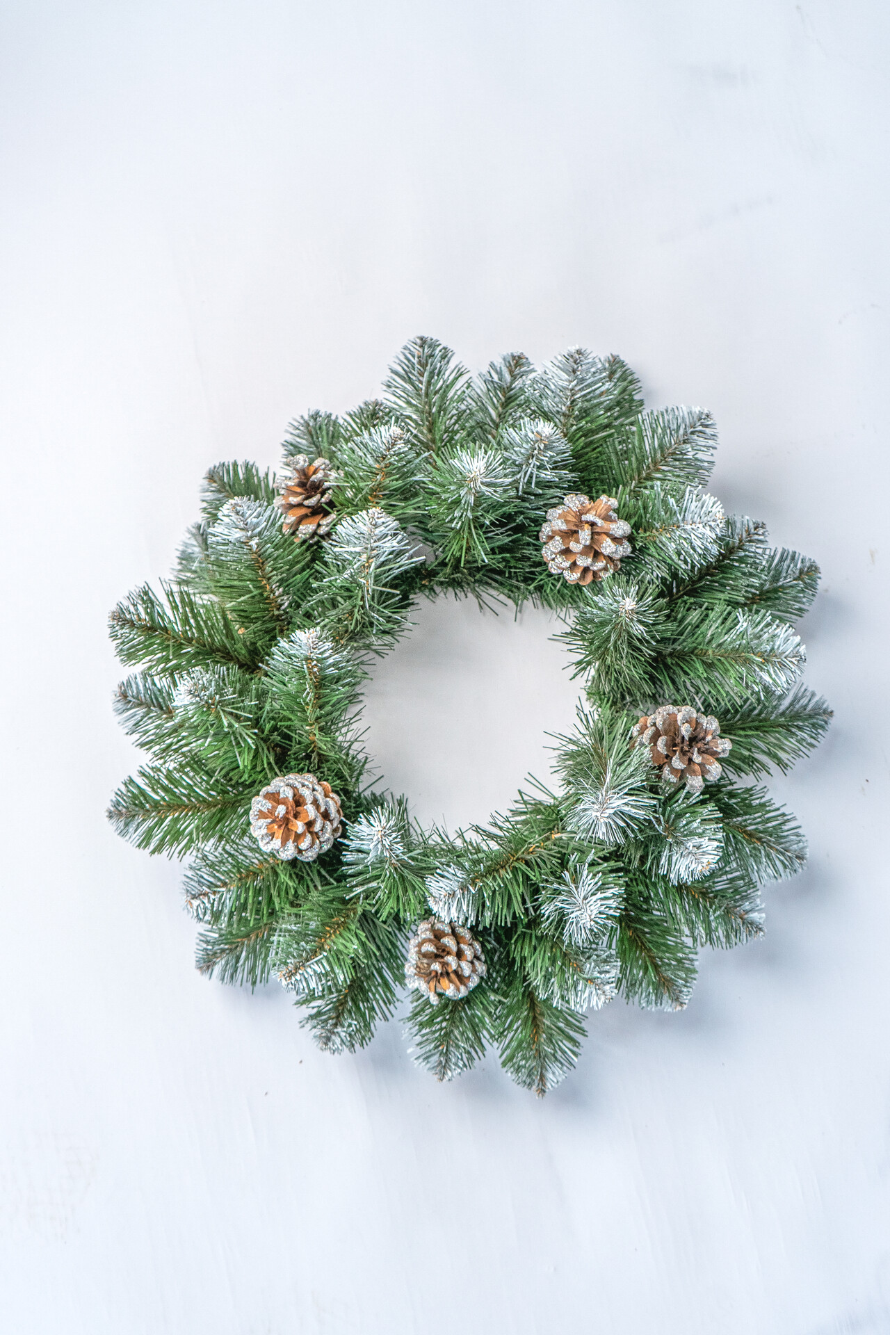 Декоративний вінок "Різдвяний з шишками" виготовлений із ПВХ-плівки та натуральних шишок, покритих блискітками.